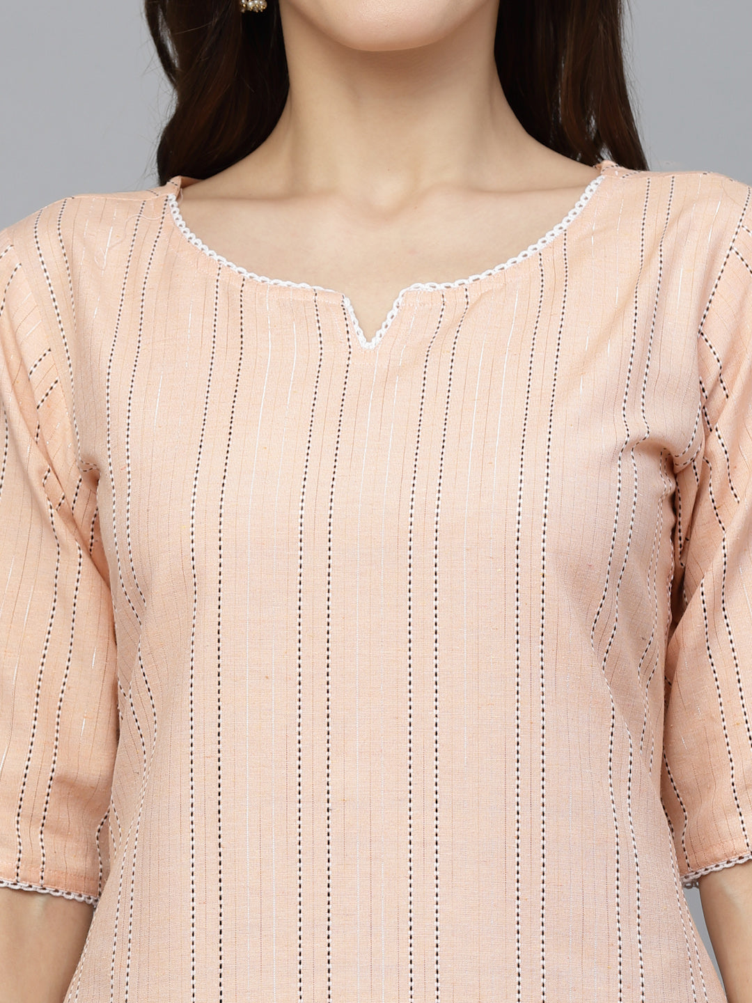 The Women's Self Woven Striped Cotton Blend Straight Kurta Pant Set is one great addition to your ethnic wear collection. Crafted from a soft and comfortable cotton blend fabric, this straight kurta set features a stylish peach self woven striped design that is sure to turn heads. The straight kurta set comes with a knotched neckline, 3/4th sleeves and side slits, giving it a contemporary and chic look. The fully elasticated pant also comes in a matching peach self woven striped design, making it easy to wear and move around in. This kurta set for women is perfect for any occasion, whether it's a casual family get-together or a formal event. Pair it with your favorite earrings and juttis to complete the look and make a fashion statement.