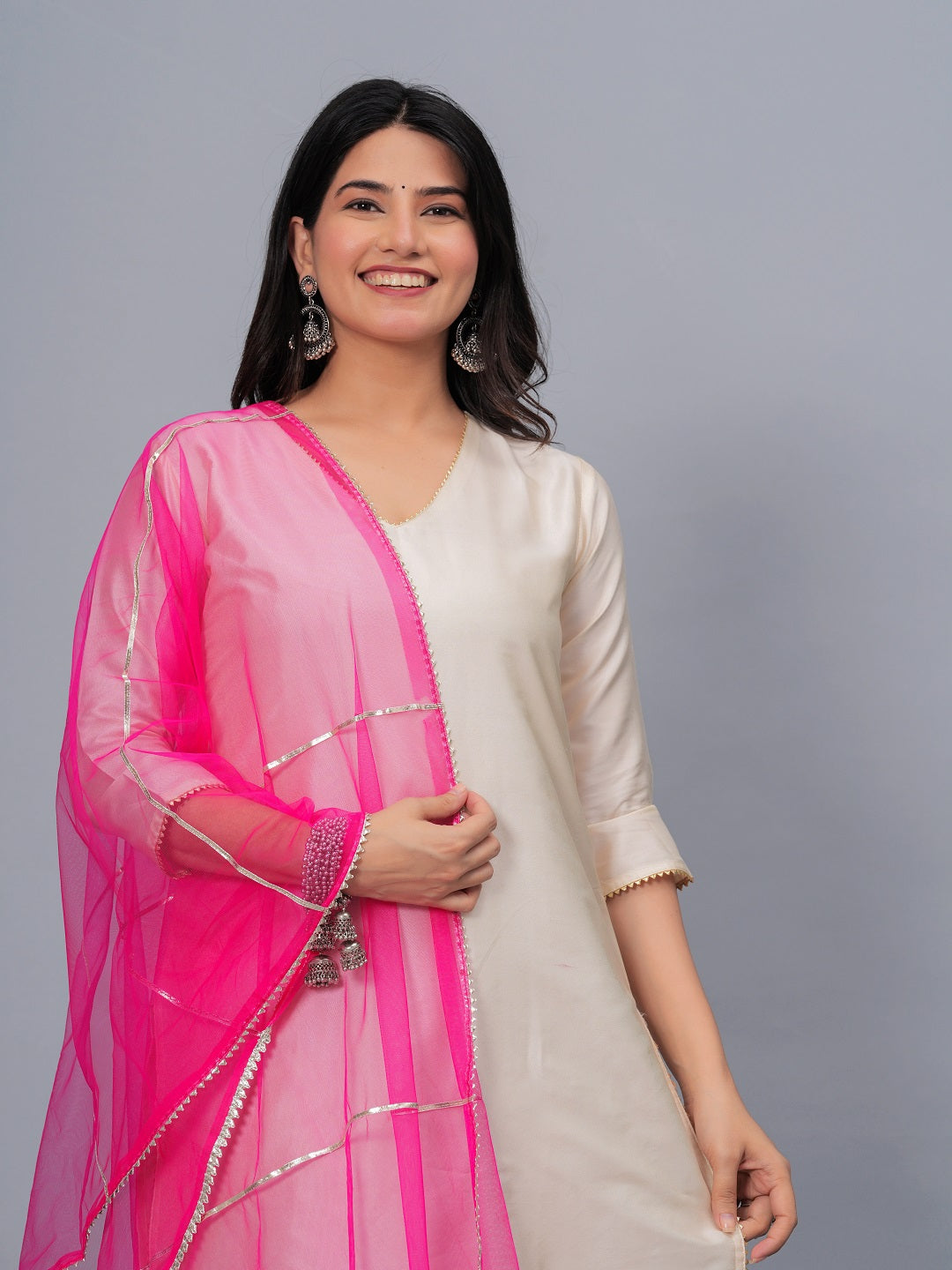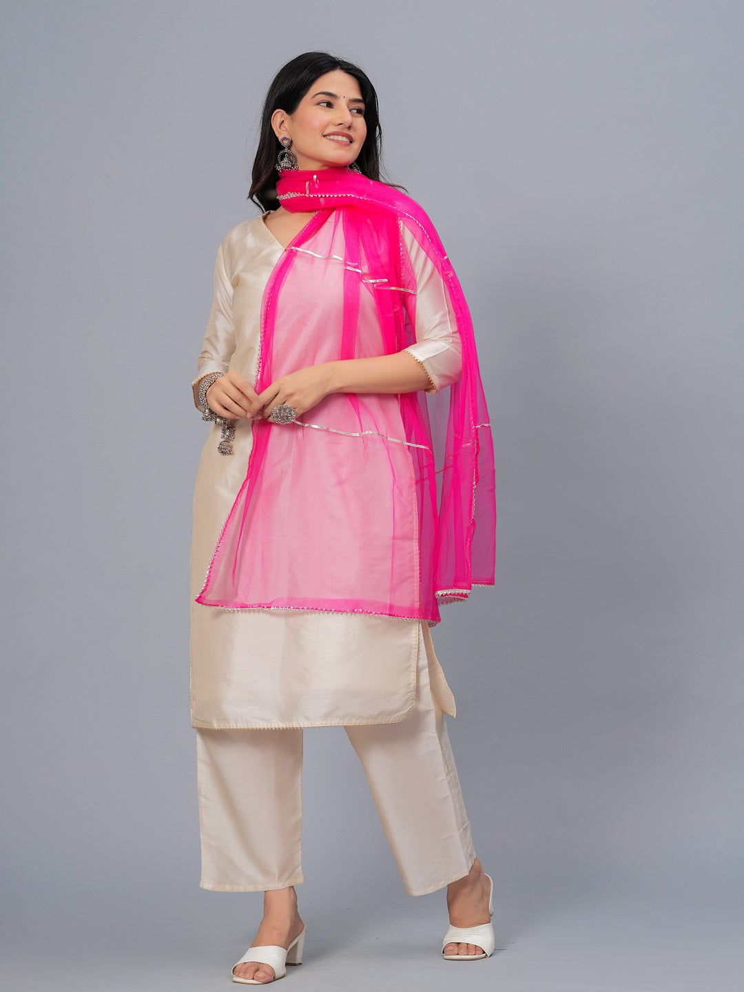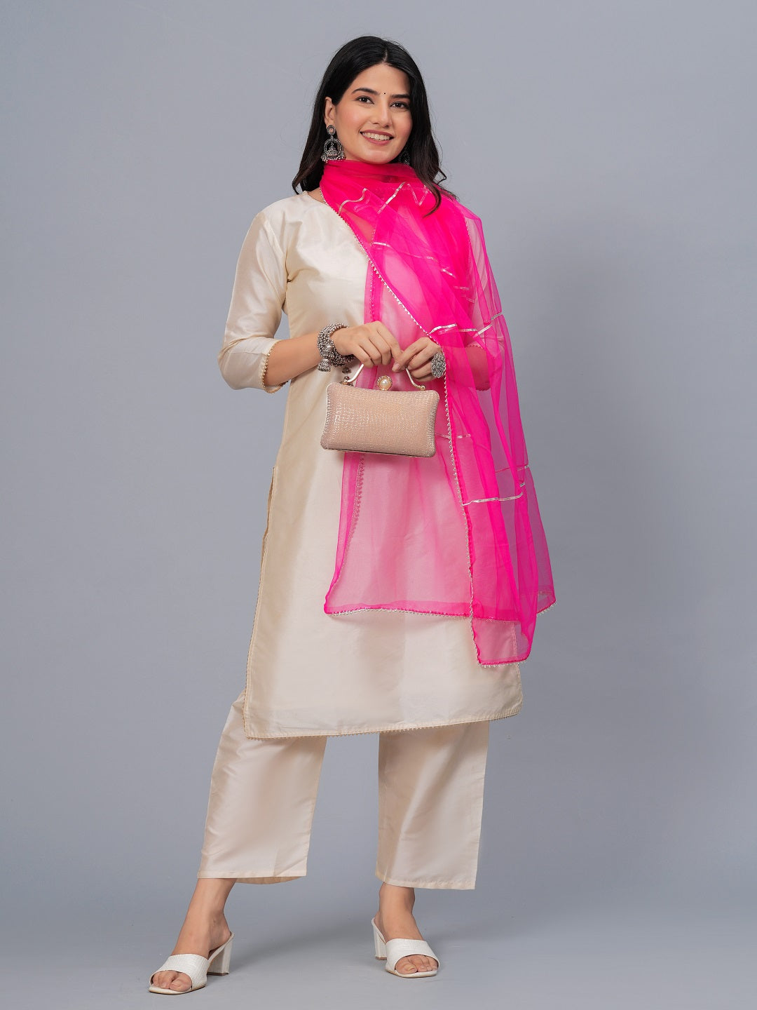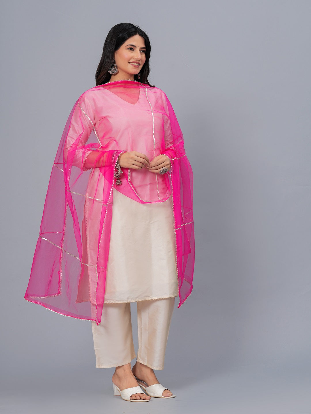 This beautiful net pink solid and Embellished dupatta detailed with lace hem will enhance your look. Pair it with kurti or tunic and mojaris for a charming appeal. Dupatta Length:- 2.25 Mtr