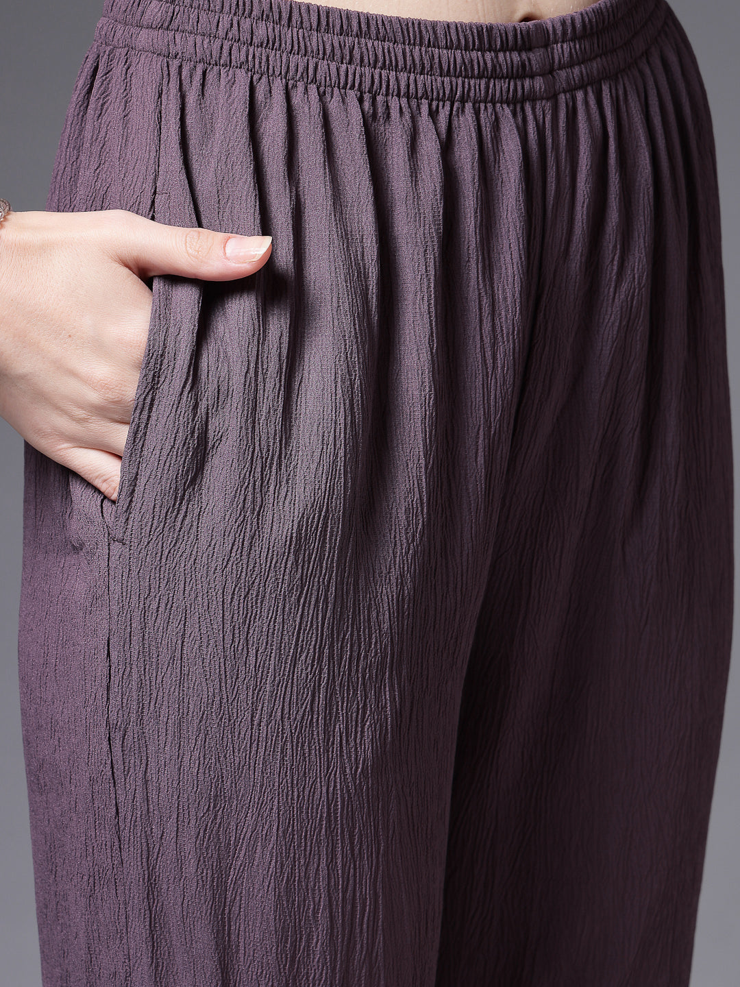 Purple solid pakistani style kurta set in silk crepe fabric. Kurta has Crochet cotton lace detailing on neckline. Fringes lace attached on sleeves. Solid pant has full elasticated waist. Embroidered organza solid white dupatta. Kurta Length- 45" Inch, pant length - 38" Inch, Dupatta length - 2.30mtr. Festive to occasion wear outfit.