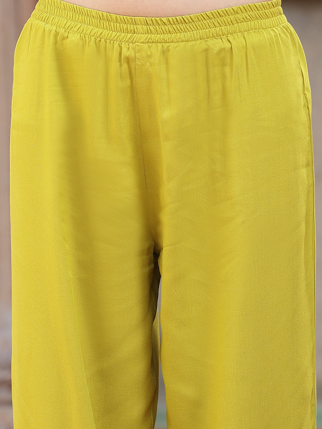 Corn colour festive rayon anarkali kurta pant dupatta set. Kurta pant and dupatta has heavy lace detailing on edges and hem. Its a trendy V-neck kurta. Solid lace detailing rayon pant has full elasticated waist. Dupatta is in organza fabric designed with laces. Kurta Length- 48" Inch, Pant Length - 38'' Inch, Dupatta Length - 2.30 mtr.