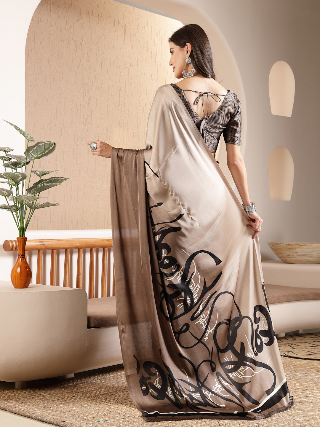 Brown Tie & Dye Print satin saree.Abstract printed saree with no border the saree comes with an unstitched blouser piece.  The blouse worn by the model might be for modelling purpose only. Check the image of unstitch blouse piece to understand how the actual blouse looks like. Saree Length- 5.5 Mtr, Blouse Piece Width- 1.06 Mtr