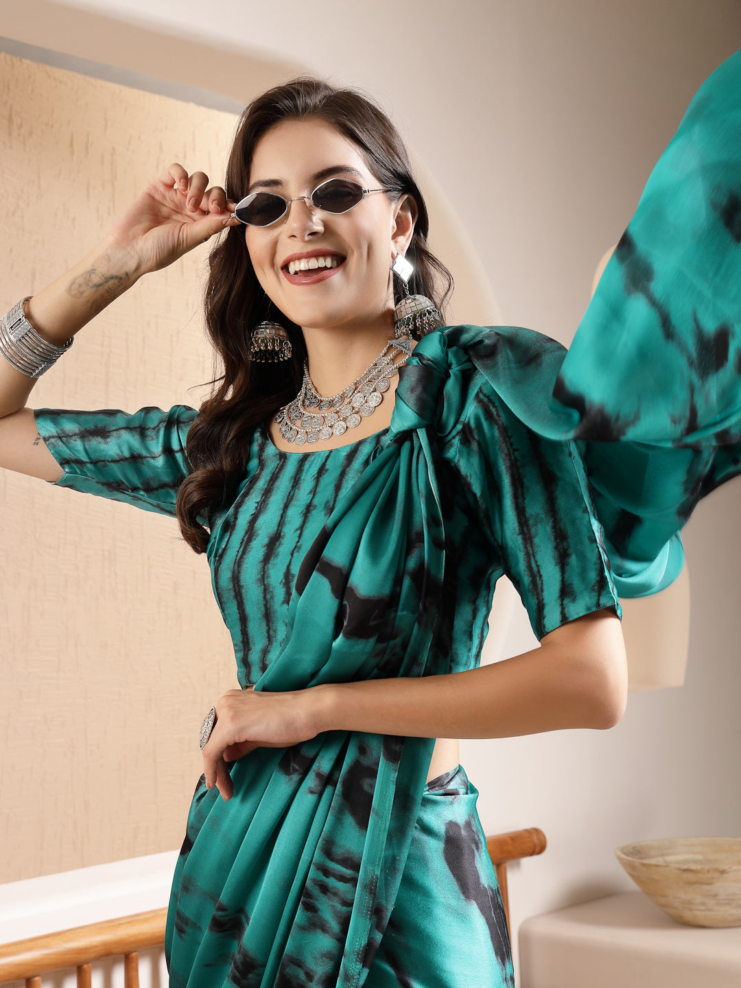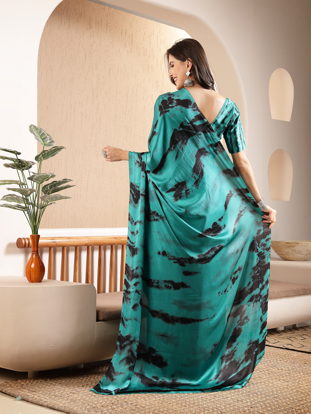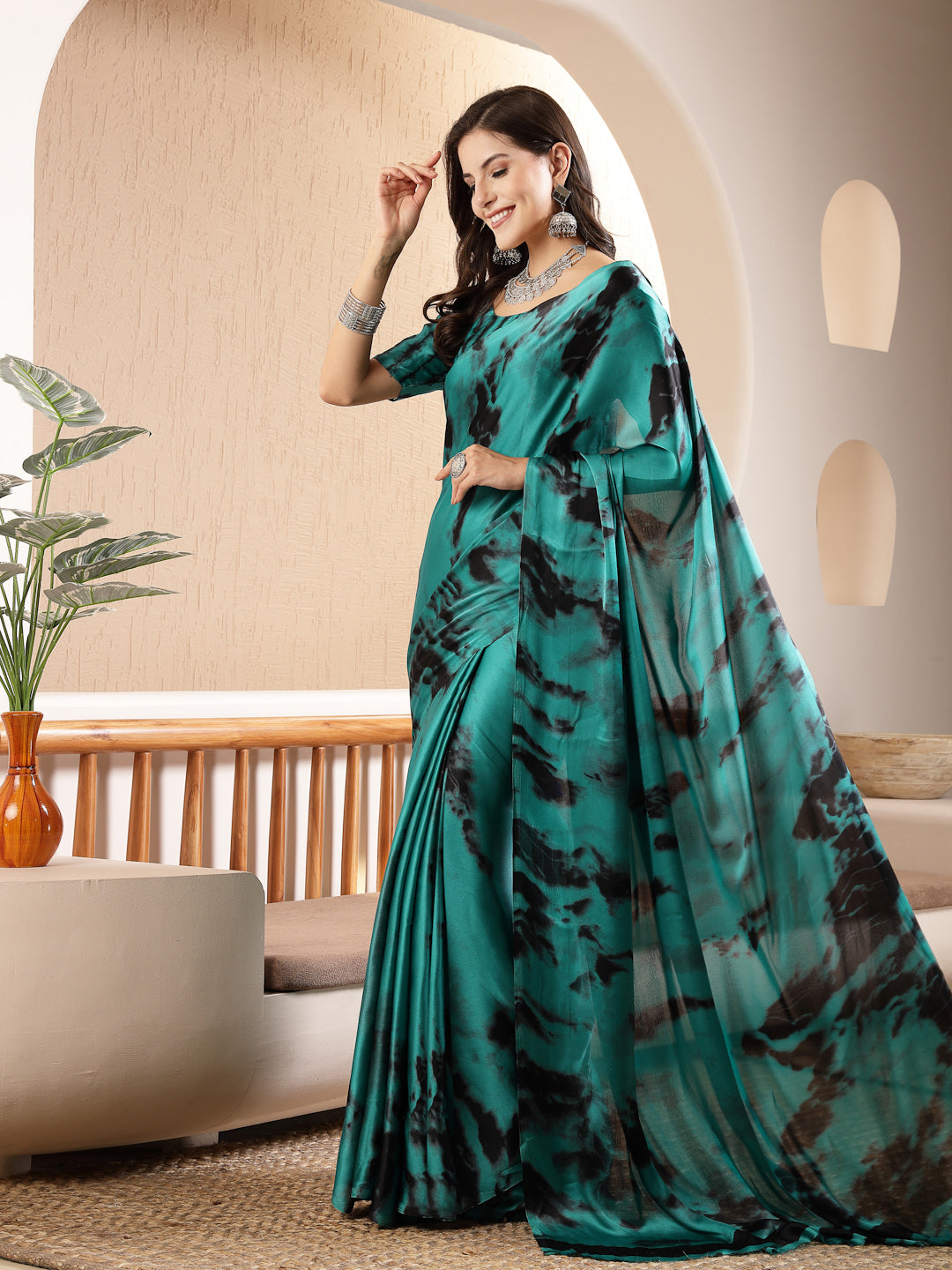 Rama Green Tie & Dye Print satin saree.Abstract printed saree with no border the saree comes with an unstitched blouser piece.  The blouse worn by the model might be for modelling purpose only. Check the image of unstitch blouse piece to understand how the actual blouse looks like. Saree Length- 5.5 Mtr, Blouse Piece Width- 1.06 Mtr