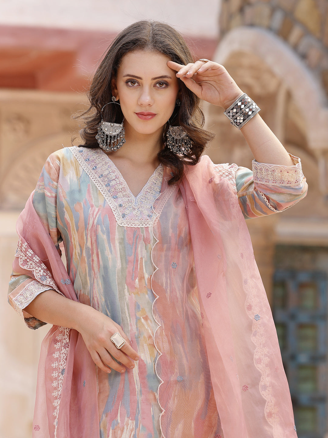Festive colourful marble printed silk blend straight kurta pant dupatta set. Kurta has embroidery on neck line with 3/4 embroidered sleeves. Solid pant has fully elasticated waistband and Organza Embroiderd dupatta. Kurta Length- 45" Inch, Pant Length - 38'' Inch, Dupatta Length - 2.25 Mtr.