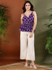 Violet floral printed rayon sleeveless short top and cotton blend lurex pant set. Top has v-neck and shoulder tie-ups. Flared lurex pant has front belt and back elasticated waistband. Pair it with smart footwear and sling to enhance the look. Products Length- 25'' Inch, trouser length- 38''.