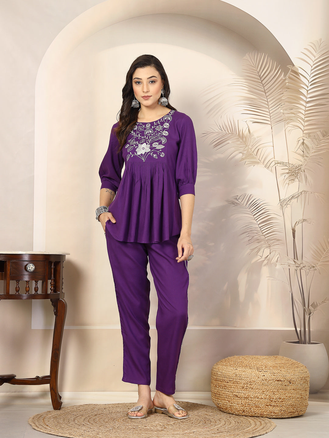 Embroidered Violet empire top co-ords set in cotton blend fabric. Round neck top has embroidery yoke on neckline. It has cuff sleeves. Paired with lace detailed trouser. Top Length - 28''Inch, Pant Length - 38" Inch.