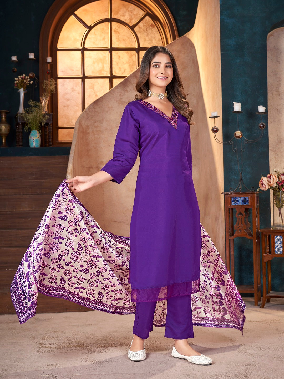 Violet festive silk blend embroidered kurta pant dupatta set. Kurta has embroidered V-neck line. Solid silk blend bottom with fully elasticated belt. Paired with kalamkari printed silk blend dupatta. Kurta Length- 45" Inch, Bottom- 38" Inch, Dupatta- 2.25 Mtr.