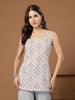 White bandhani printed rayon straight top. Top has scoop neckline with back side dori-tassels & strappy sleeves with adjustable strap. Top Length- 29'' Inch. Suitable for warm weather. Pair with silver jhumkas (earrings) and bangles; Juttis or flats for an ethnic look, block heels or wedges for a more dressed-up event and sandals or sneakers for a casual day out.