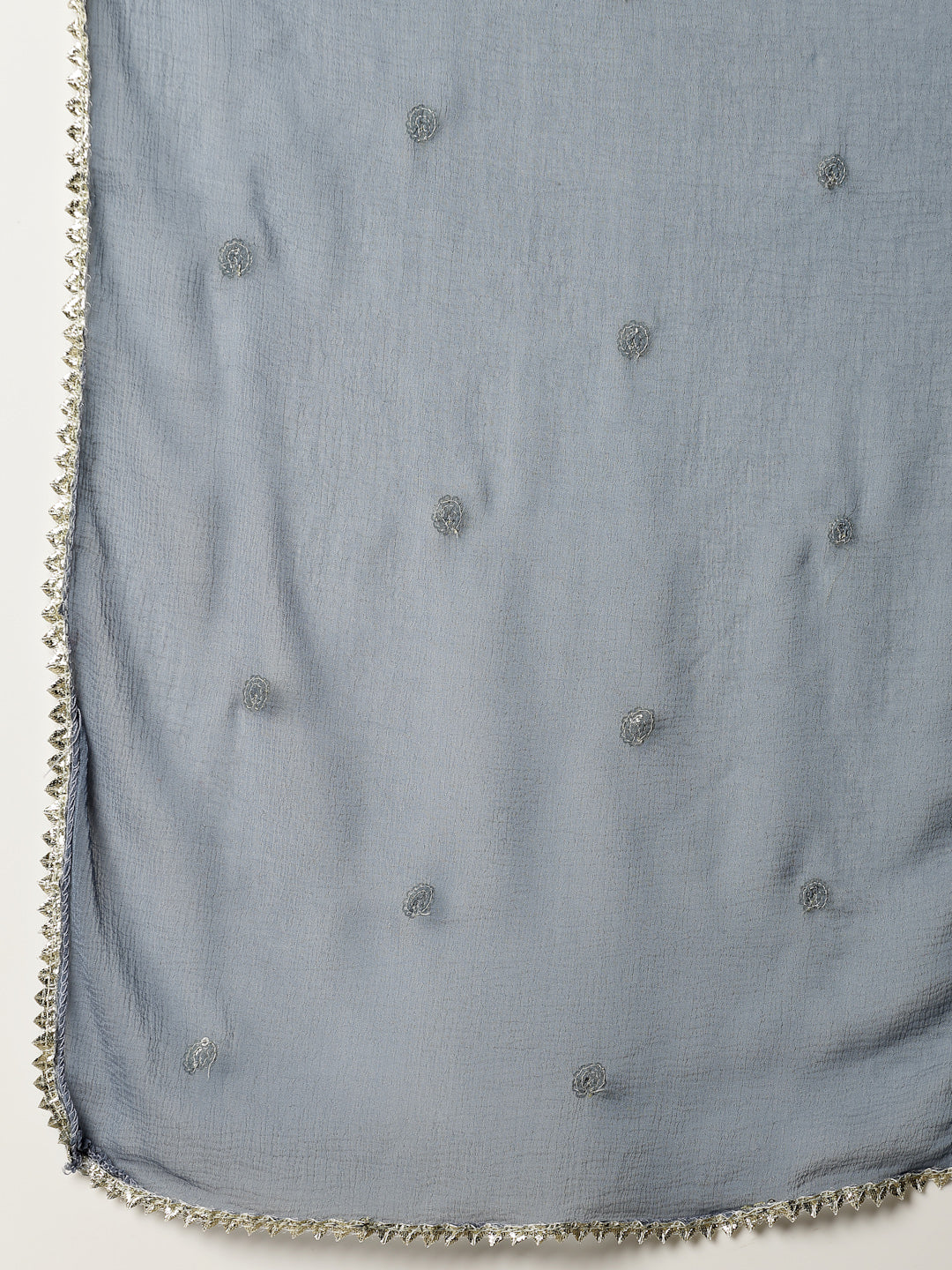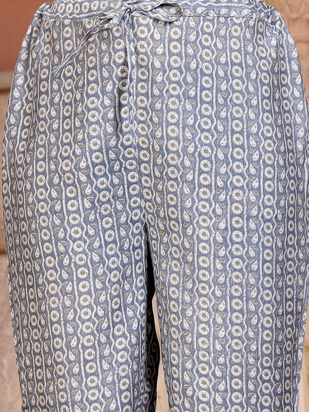 Festive a-line white paisley printed silk blend kurta with pant and dupatta set. Kurta has embroidered v-neck line. Fully elasticated printed bottom. Paired with dyed chiffon embroidered dupatta. Kurta Length- 45" Inch, Pant Length - 38'' Inch, Dupatta Length - 2.30 mtr
