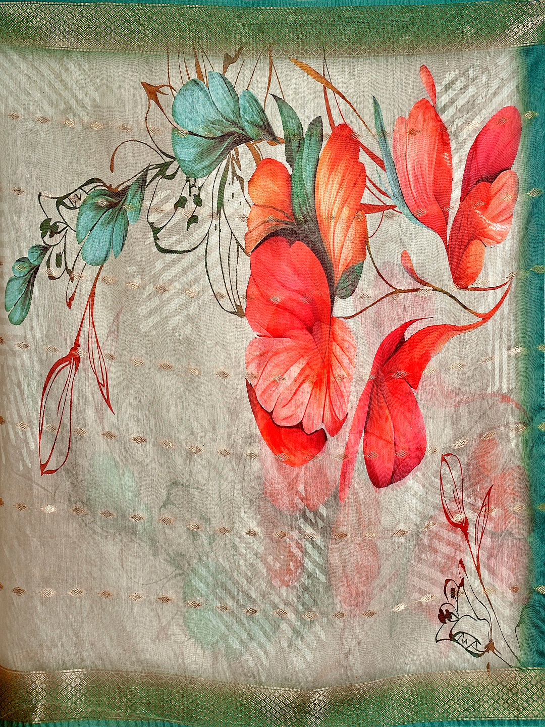 White self embroidered tropical printed kurta pant dupatta set. Shifli embroidered straight v- neck kurta has organza and lace detailing on it. Pant has fully elasticated waist belt. Paired with printed rayon dupatta, Kurta Length-45" Inch, Pant Length-38'' Inch, Dupatta Length - 2.20 Mtr