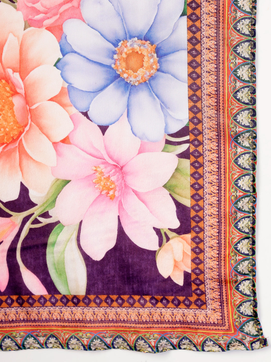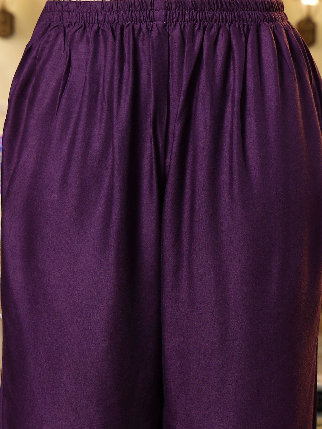 Wine embroidered rayon straight kurta pant dupatta set. kurta has embroidered work on v-neck, 3/4 sleeves. Fully elasticated solid pant and paired with printed slik blend dupatta with lace. Kurta Length- 45'' Inch, Pant Length- 38'' Inch, Dupatta Length-2.30 Mtr.