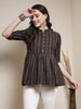 Coffee brown yarn dyed cotton blend peplum top with 3/4th sleeves and wooden buttons on placket. Top Length-28'' Inch.