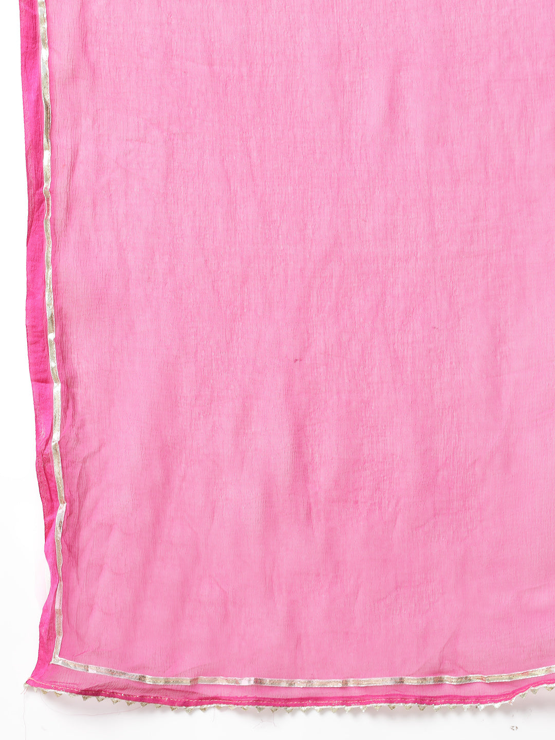 Coral cotton blend anarkali kurta with pant dupatta set. Kurta has beautiful embroidery in yoke and with 3/4 sleeve, anarkali bottom and sleeve has gota detailing on it with fully elasticated solid cotton blend pant and chiffon ombre shaded dupatta, Kurta Length- 48" Inch, Pant Length - 38'' Inch, Dupatta Length - 2.30 mtr