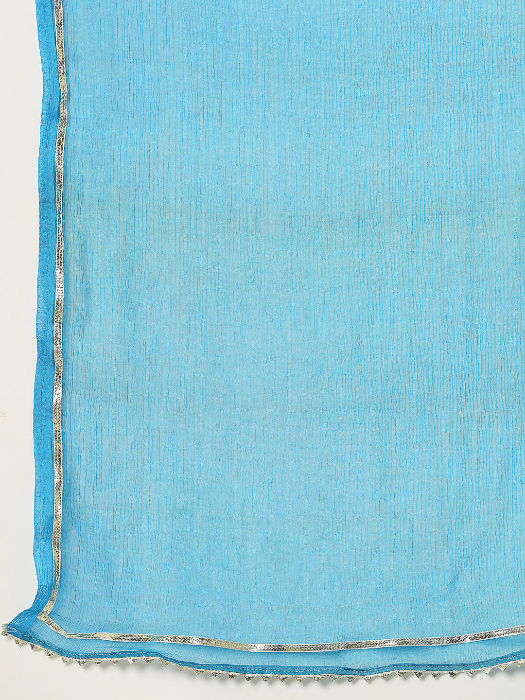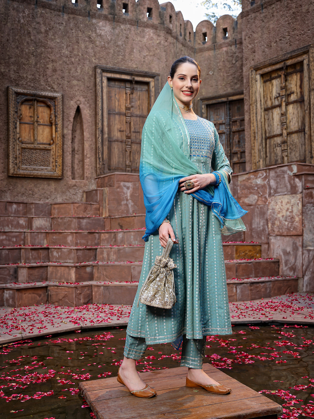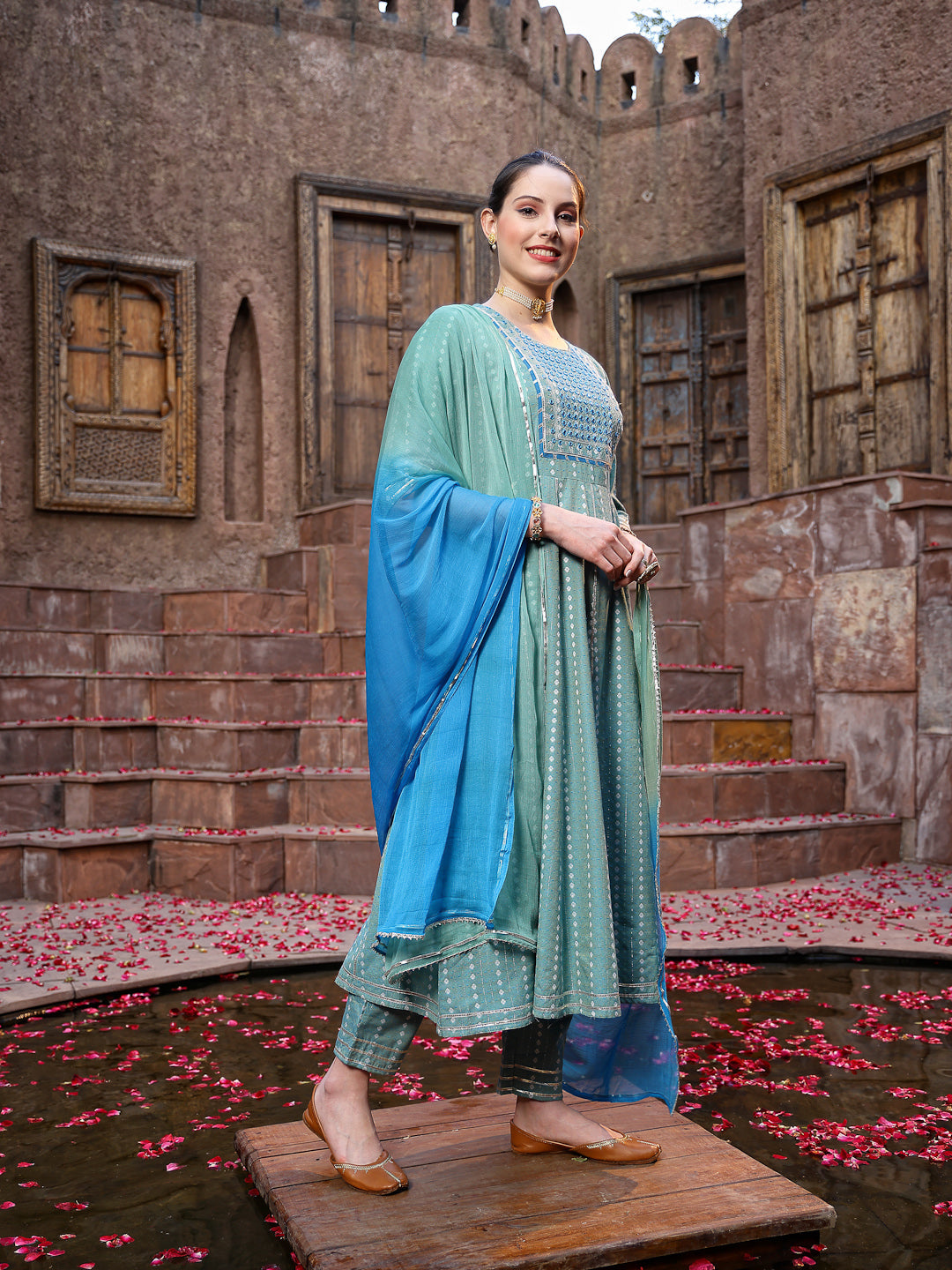 Turquoise cotton blend anarkali kurta with pant dupatta set. Kurta has beautiful embroidery in yoke and with 3/4 sleeve, anarkali bottom and sleeve has gota detailing on it with fully elasticated solid cotton blend pant and chiffon ombre shaded dupatta, Kurta Length- 48" Inch, Pant Length - 38'' Inch, Dupatta Length - 2.30 mtr