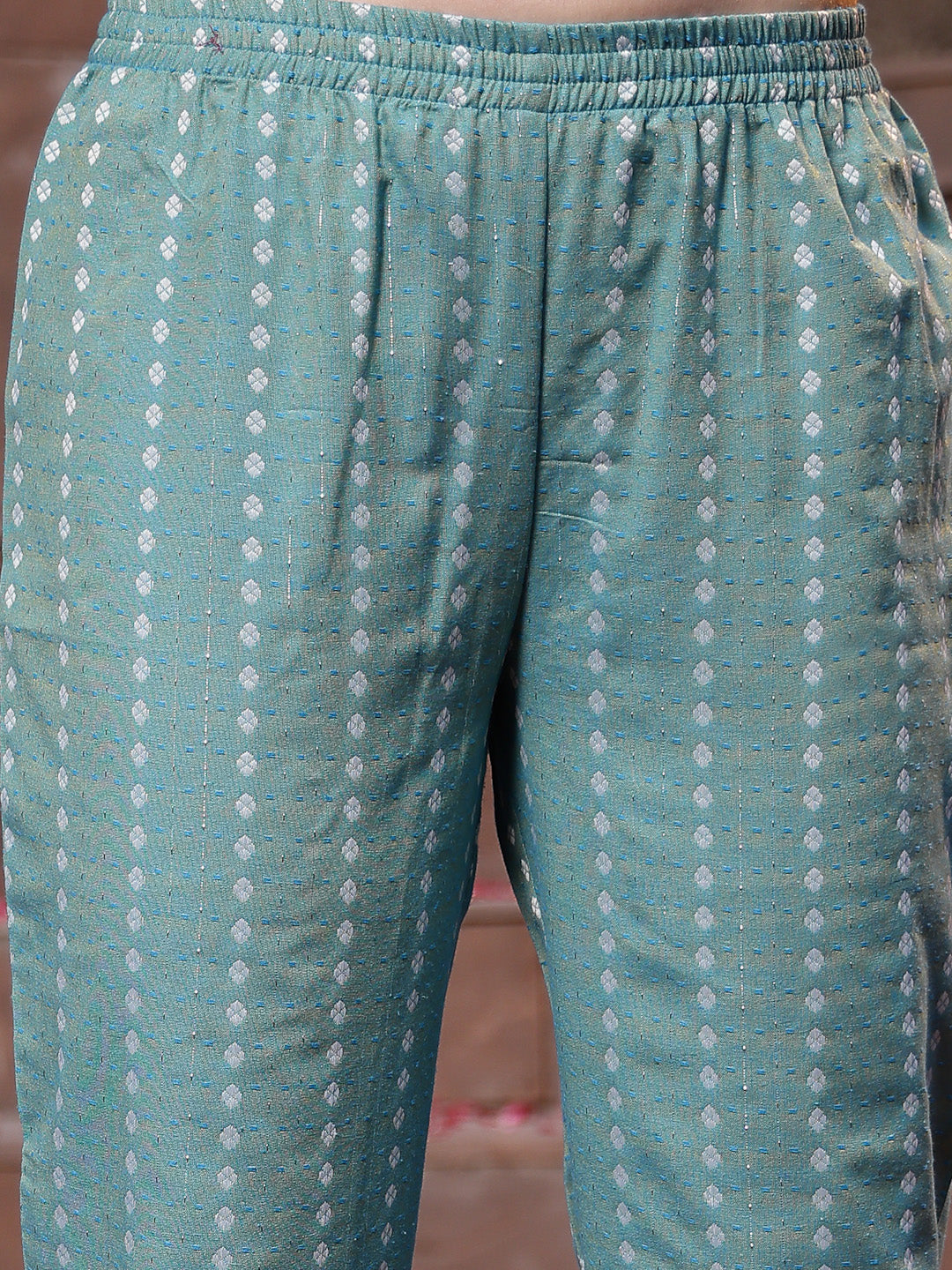 Stylum Women's Woven Designed & Embroidered Cotton Blend Anarkali Kurta Pant Dupatta Set (KPDTURQVISA)