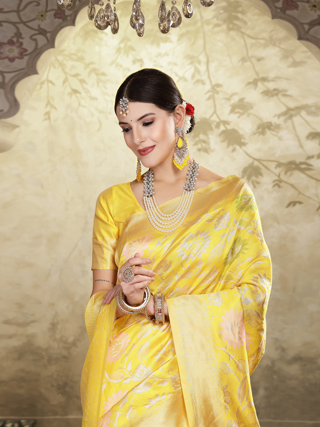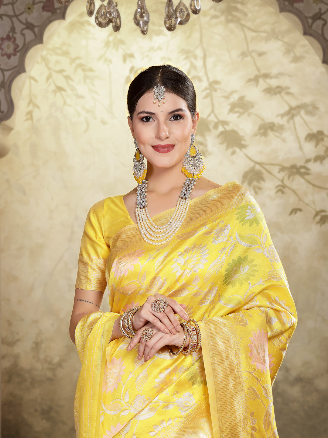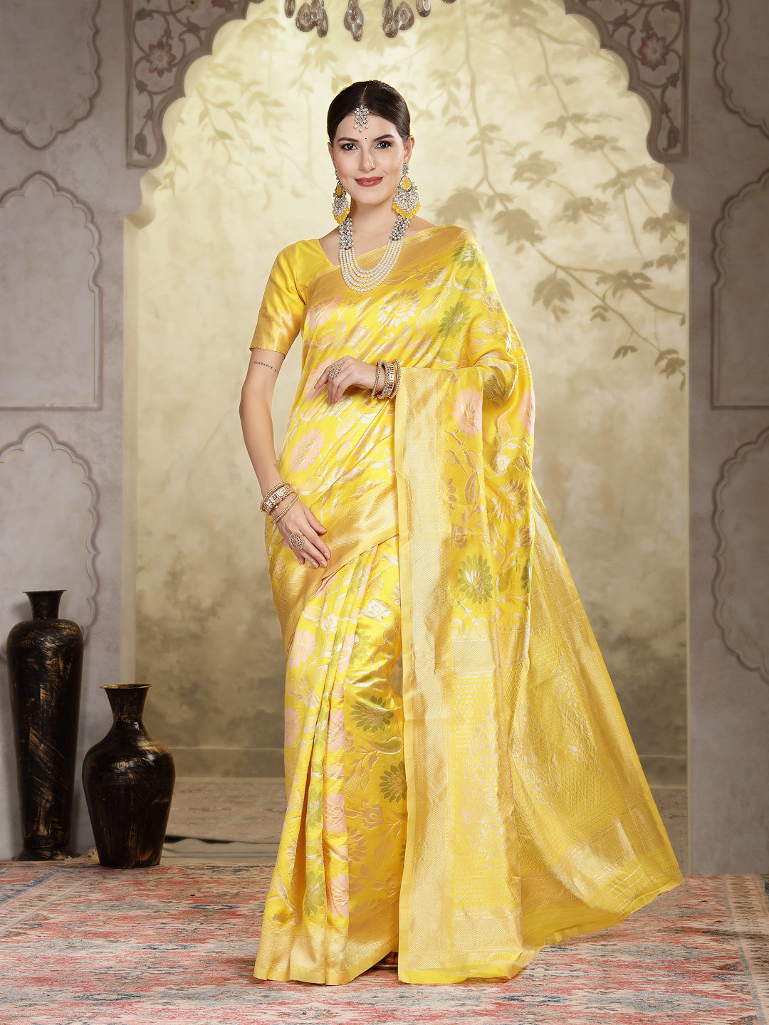 Yellow Paisley Printed Banarsi Saree. This Elegant Floral Party wear Saree Is With Zari Border. Saree Length- 5.5 Mtr, Blouse piece lenght- 0.8 Mtr