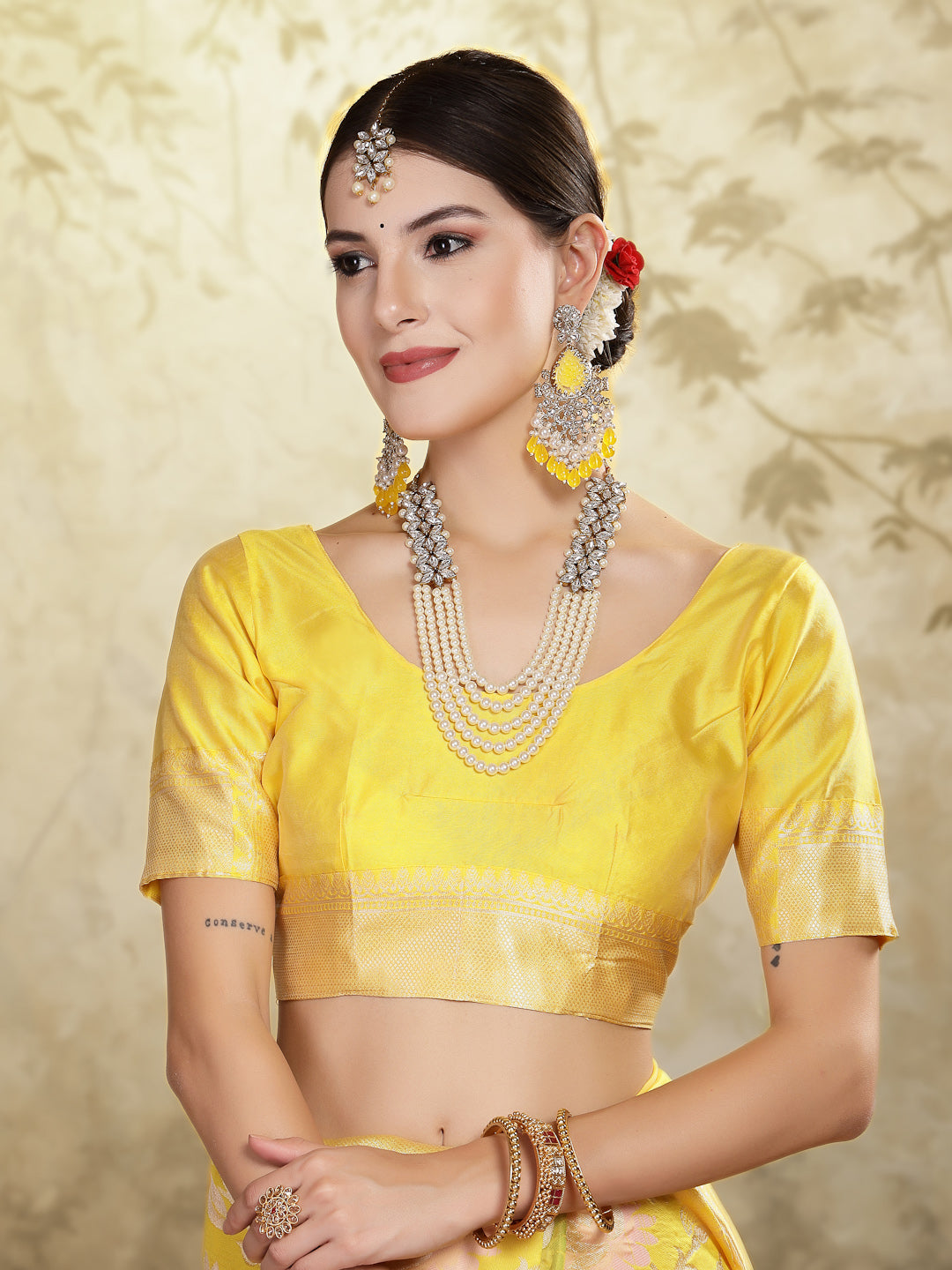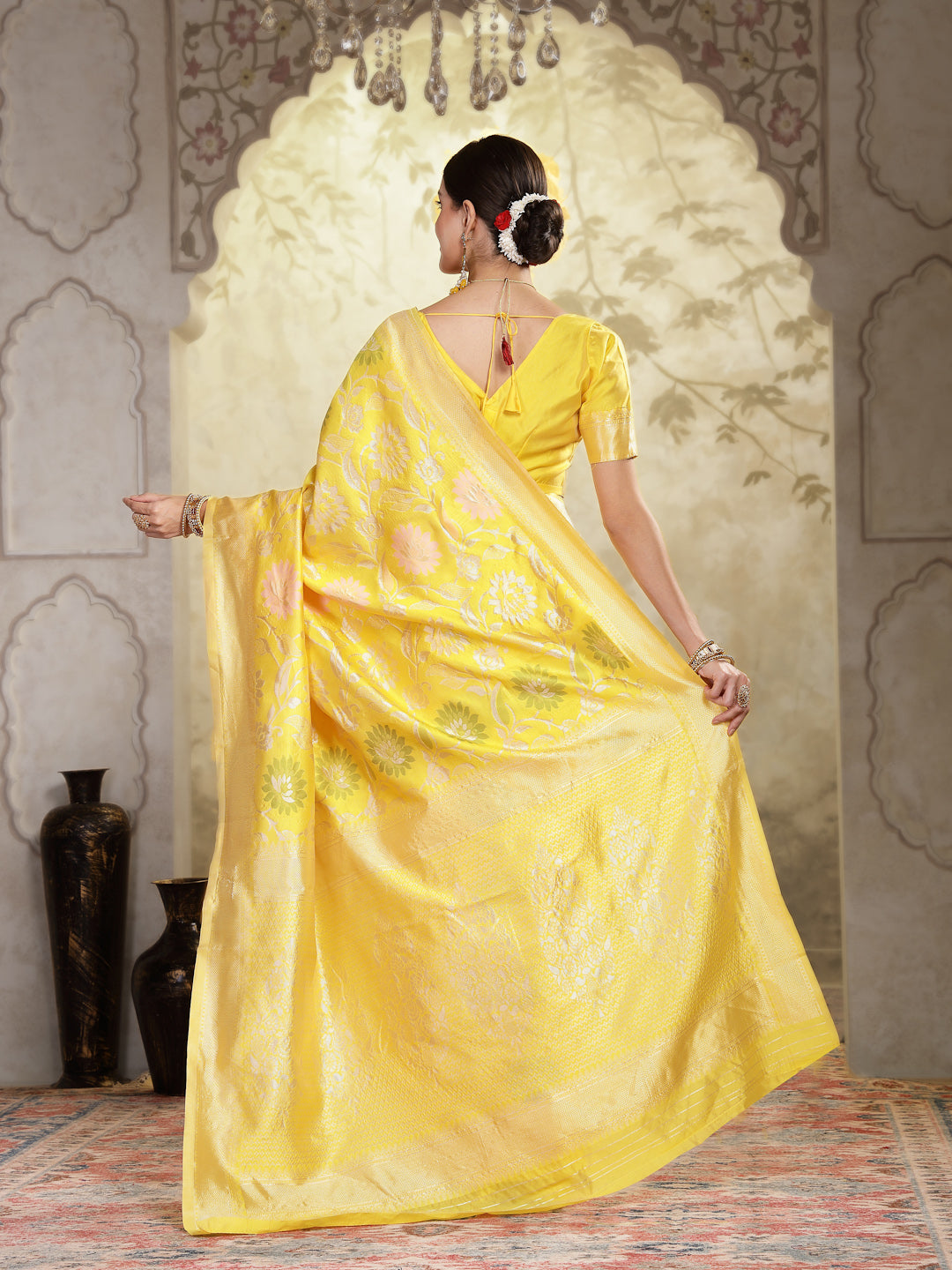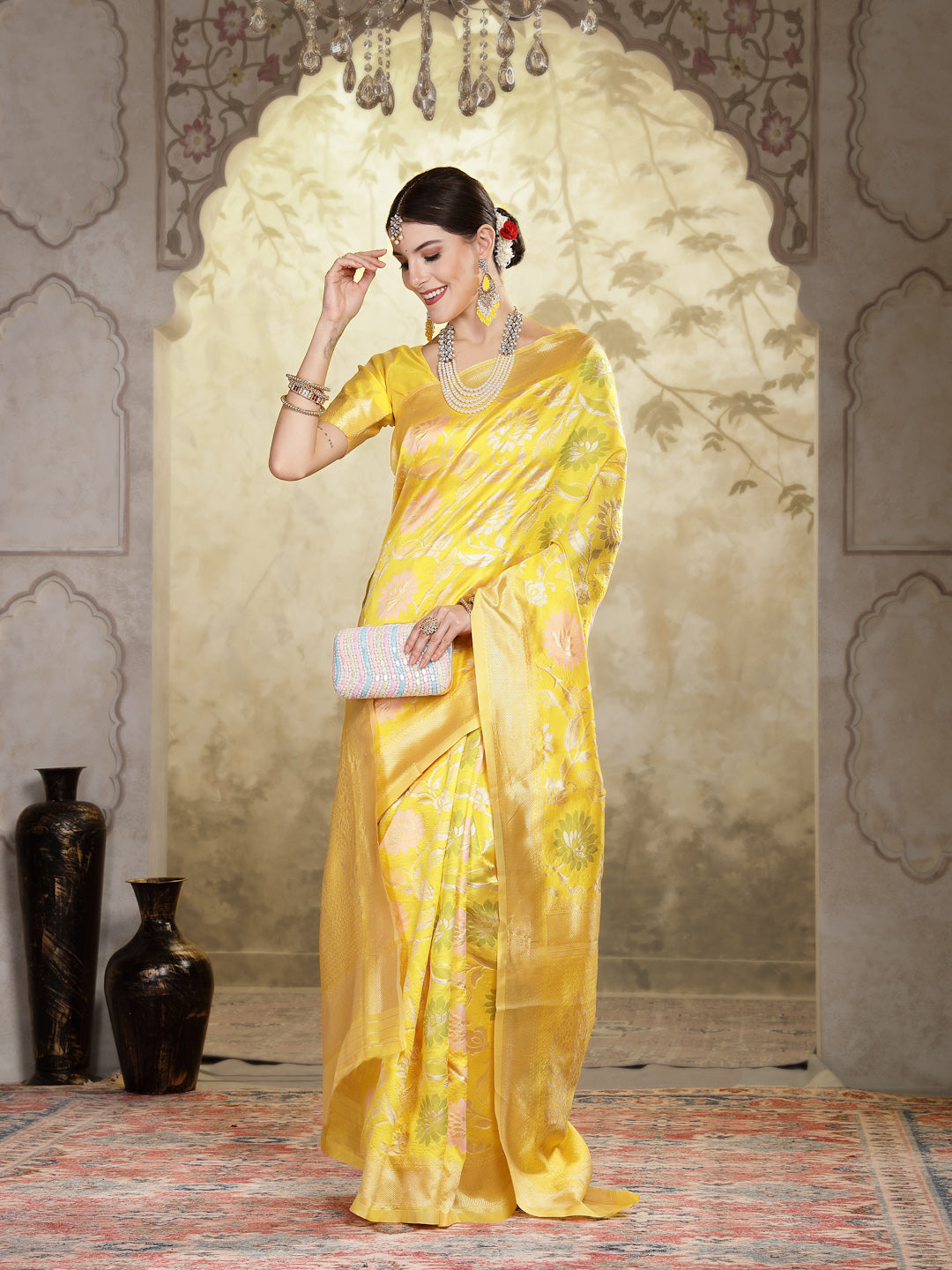 Yellow Paisley Printed Banarsi Saree. This Elegant Floral Party wear Saree Is With Zari Border. Saree Length- 5.5 Mtr, Blouse piece lenght- 0.8 Mtr